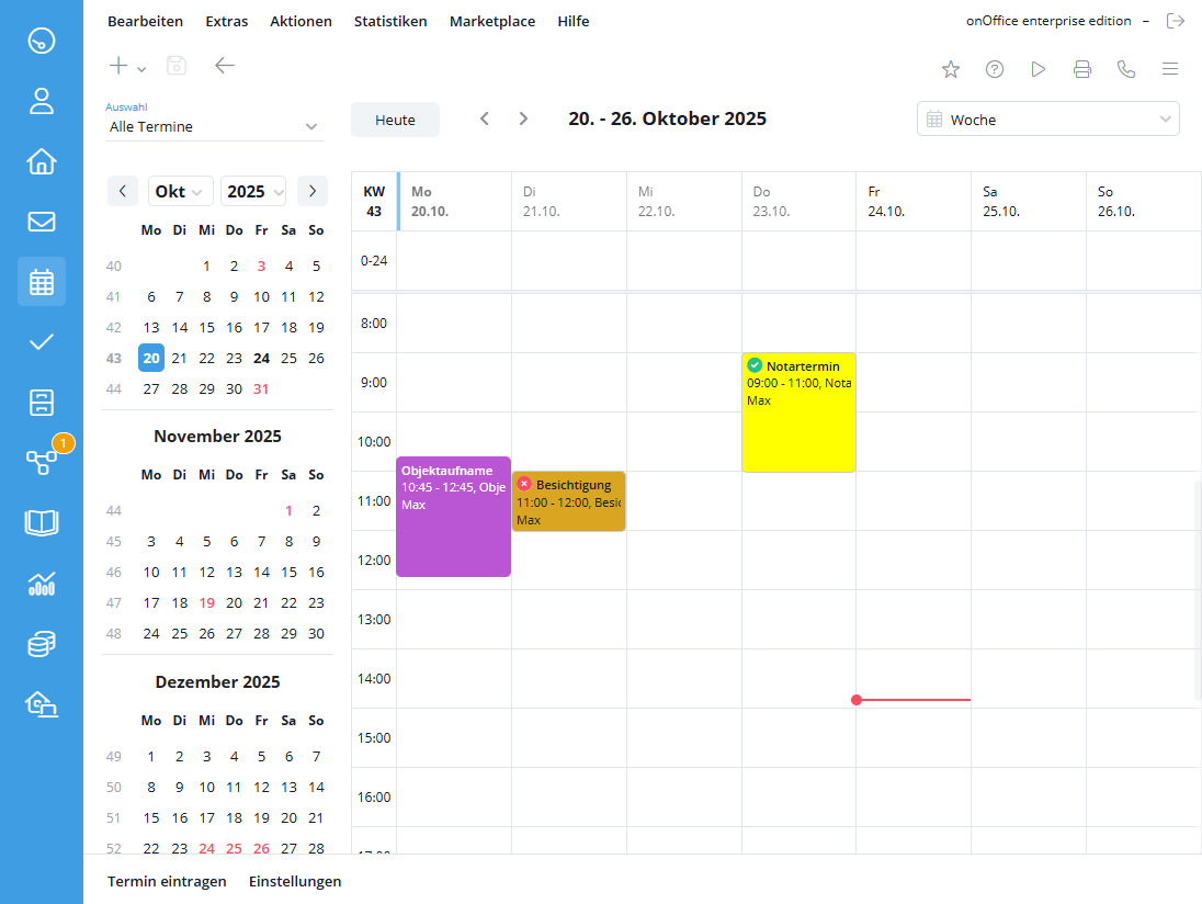 Mit der Terminverwaltung von onOffice enterprise erhalten Sie eine komplette Übersicht Ihrer Termine, wahlweise in verschiedenen Ansichten. Nach von Ihnen festgelegter Farbdefinition werden die Termine farbig für den jeweiligen Nutzer angezeigt.