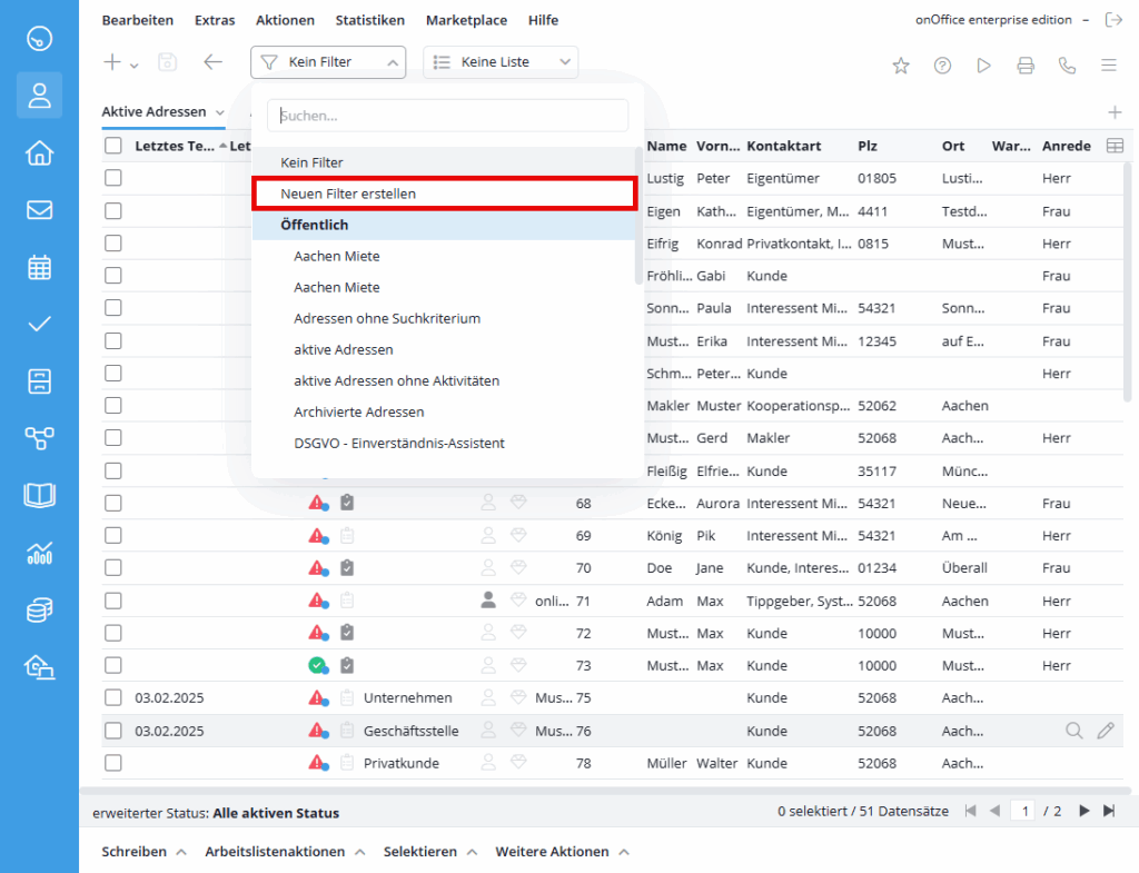 Frequently used filters can be saved and you can specify whether the filter should have a public or private status. To display the filtered addresses, simply click on the “List view” button in the action box on the left. “Deactivate filter” deactivates the currently active filters.