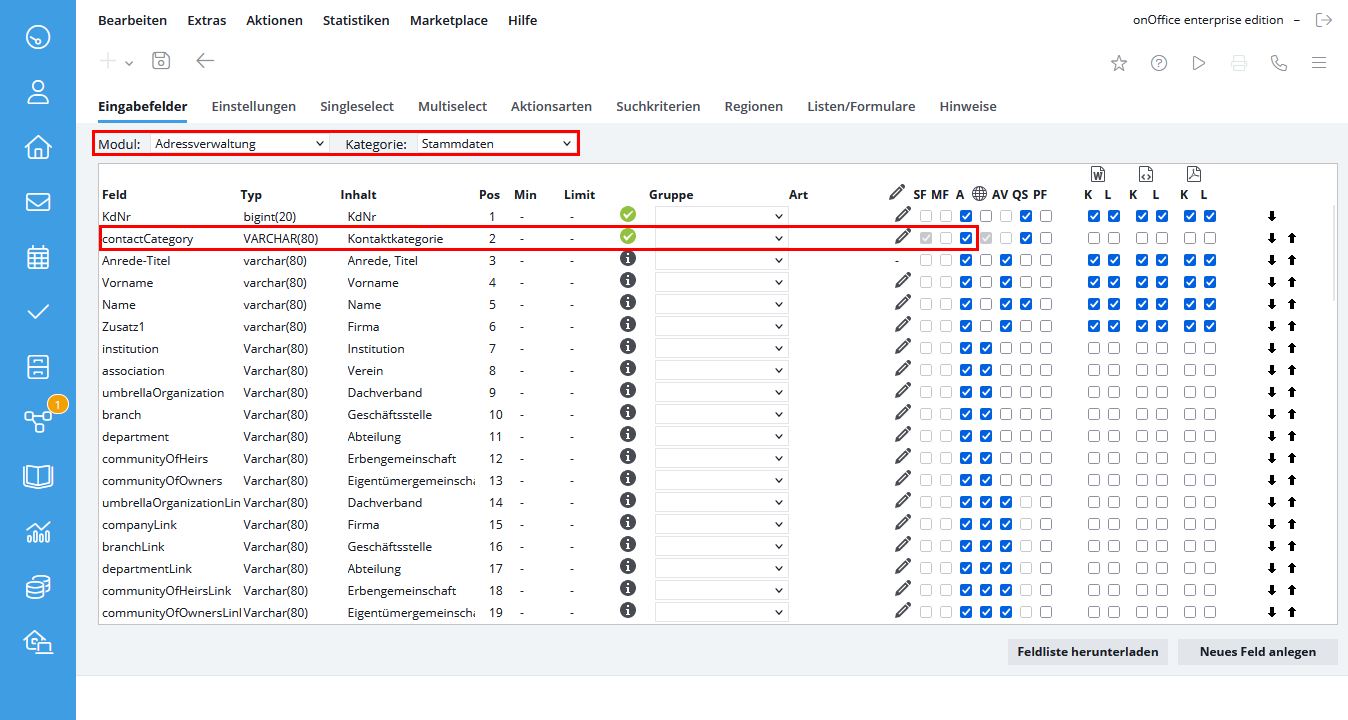 Sobald Sie die Kontaktkategorie aktiviert haben, werden die passenden Felder und Feldfilter freigeschaltet. Diese sind bereits vorkonfiguriert, können aber durch Sie angepasst werden. Haben Sie ein individuelles Feld, welches z.B. nur für ein Unternehmen angezeigt werden soll? Dann fügen Sie die Kontaktkategorie „Unternehmen“ dem Feldfilter dieses Feld hinzu. Nähere Informationen dazu finden Sie hier.