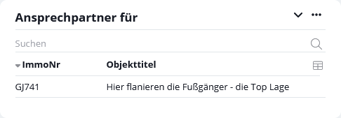 In dieser Box sehen Sie, für welche Immobilien die geöffnete Adresse als Ansprechpartner eingetragen ist. Über die Suchzeile können Sie außerdem Immobilien auswählen, in denen der Kontakt als Ansprechpartner hinterlegt wird.