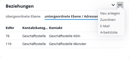Über die Beziehungsbox können Sie die über- und untergeordneten Adressen des geöffneten Kontakts einsehen. Beachten Sie bitte, dass jeweils nur die darüber oder darunterliegende Ebene angezeigt wird.