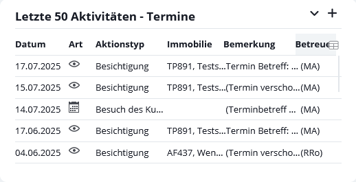 Die „Aktivitäten Historie Box“ können Sie den Adressgrunddaten nur einmal hinzufügen. In dieser Box werden Ihnen alle Aktivitäten des Adressdatensatzes, ohne Einschränkung, angezeigt.