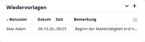 Über das Symbol können Sie eine neue Wiedervorlage anlegen. Im darauf erscheinenden Pop-up Fenster können Sie den Benutzer, das Datum und die Bemerkung für die Wiedervorlage einsetzen.