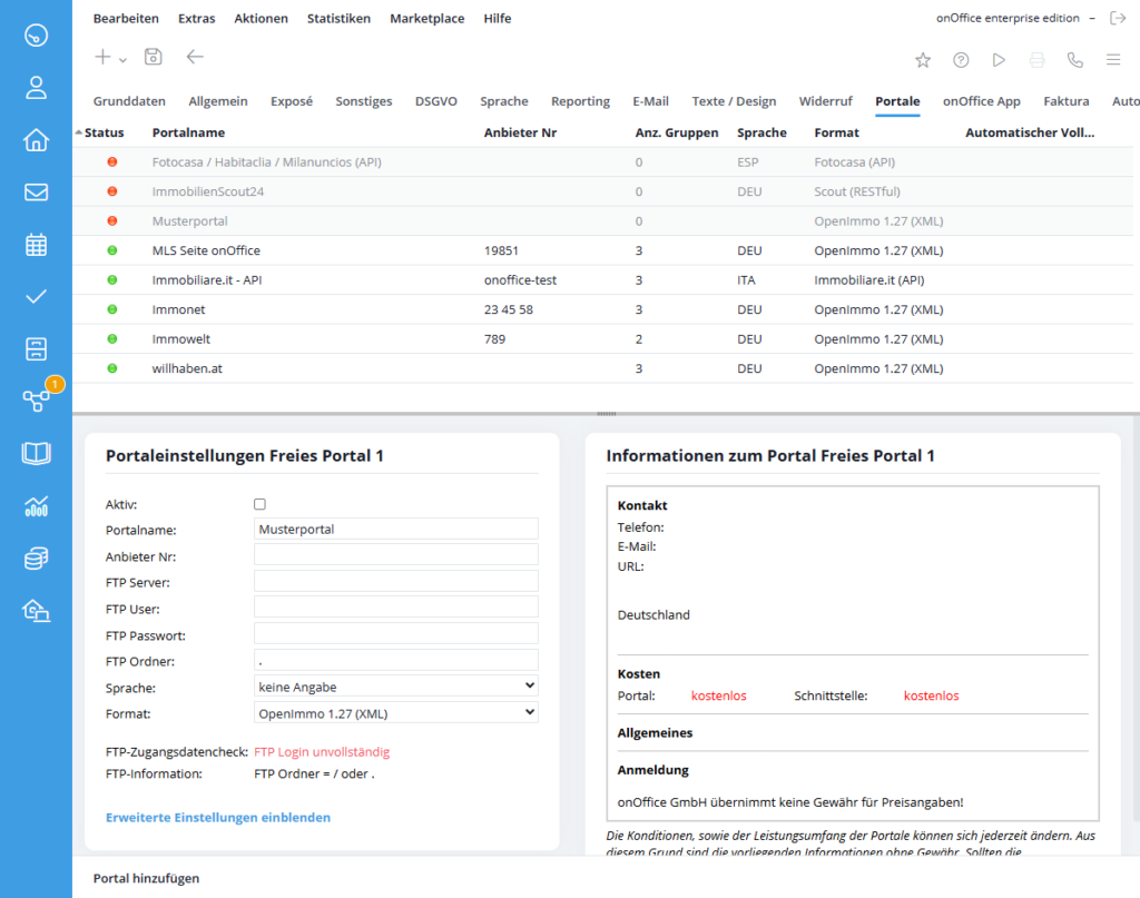 Para publicar tus inmuebles en los portales inmobiliarios, debes activar los portales correspondientes. En Extras >> Configuración >> Ajustes básicos >> Portales encontrarás la administración de las interfaces de los portales. Algunos portales gratuitos ya están configurados y activados.