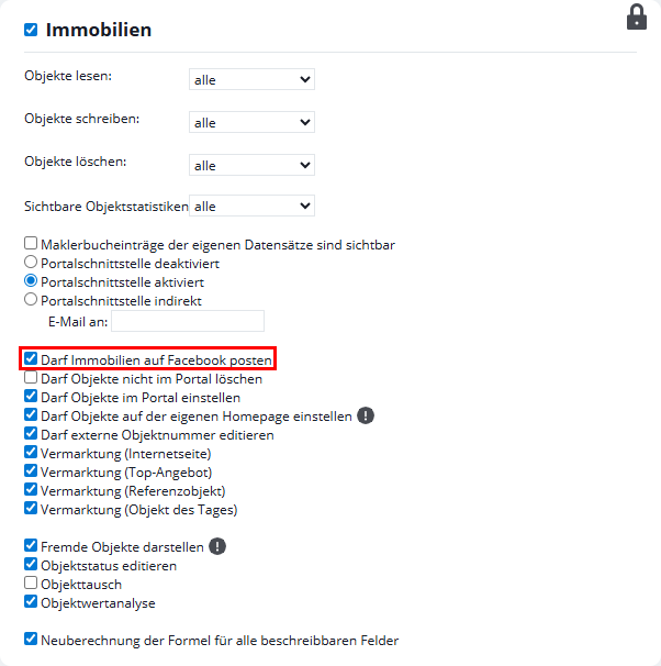 Nei diritti dell’utente puoi stabilire se l’utente è autorizzato o meno a pubblicare immobili su Facebook. Nella categoria “Immobili”, spunta la casella “Può pubblicare immobili su Facebook”.