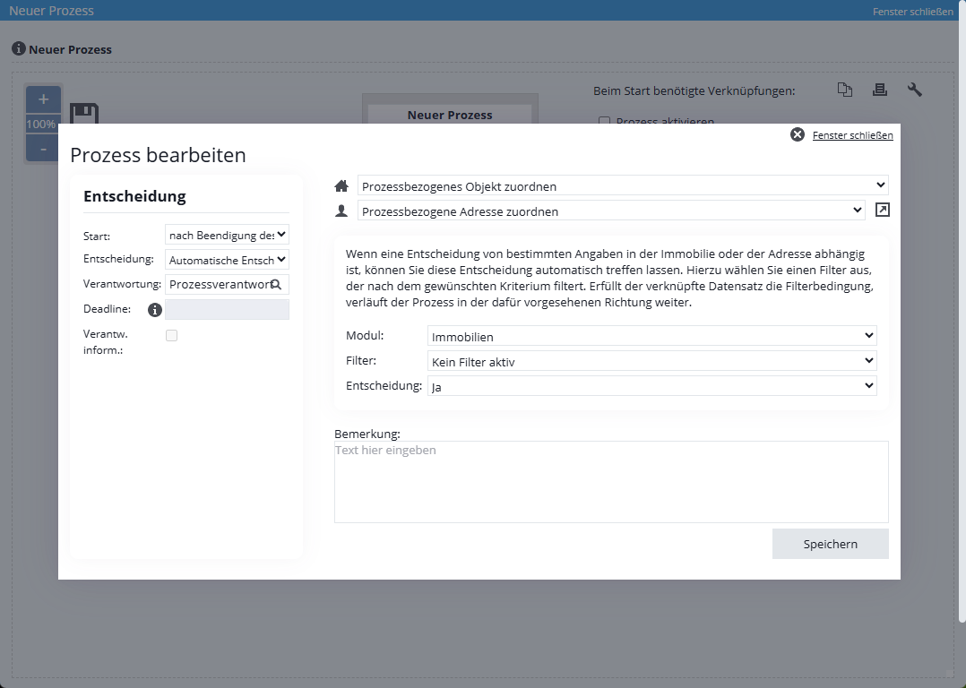 Il modulo specifica se per la decisione deve essere utilizzato un filtro di contatto o di immobile . Le opzioni di selezione dipendono dall’immobile esistente o dall’assegnazione del contatto del processo. È possibile selezionare solo un modulo alla volta per la decisione.