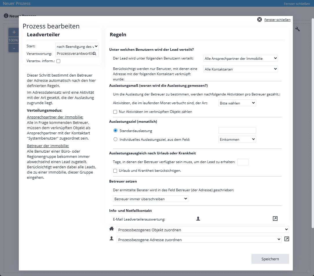 Non si devono apportare modifiche al distributore di lead. In questo punto si deve sempre selezionare “Assegnazione di un oggetto relativo al processo” e “Assegnazione di un contatto relativo al processo”.