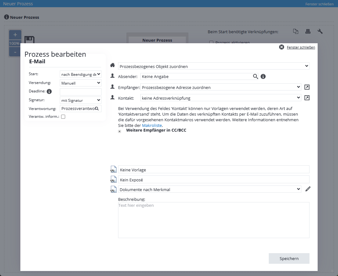 È possibile utilizzare il selettore accanto a Contatto per inviare un contatto selezionato o, ad esempio, inquilino/acquirente o simili di un immobile nell’email. È possibile utilizzare la macro _Kontakt(Name; Vorname, ecc.) per trasmettere i dati specifici del contatto nell’email.