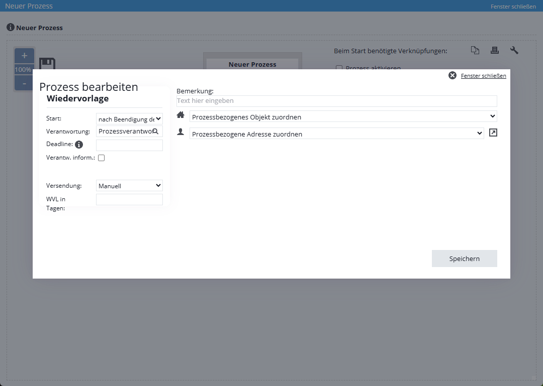 In termini di responsabilità, è possibile scegliere tra il responsabile del processo, il responsabile del record di dati dell’immobile o del contatto collegato al processo (il prerequisito è, ovviamente, che un record di dati dell’immobile o dell’indirizzo sia collegato alla fase del processo) o un utente diretto. La fase del processo è quindi visibile alla persona responsabile nell’ambito del processo corrente e deve essere creata e completata da quest’ultima.