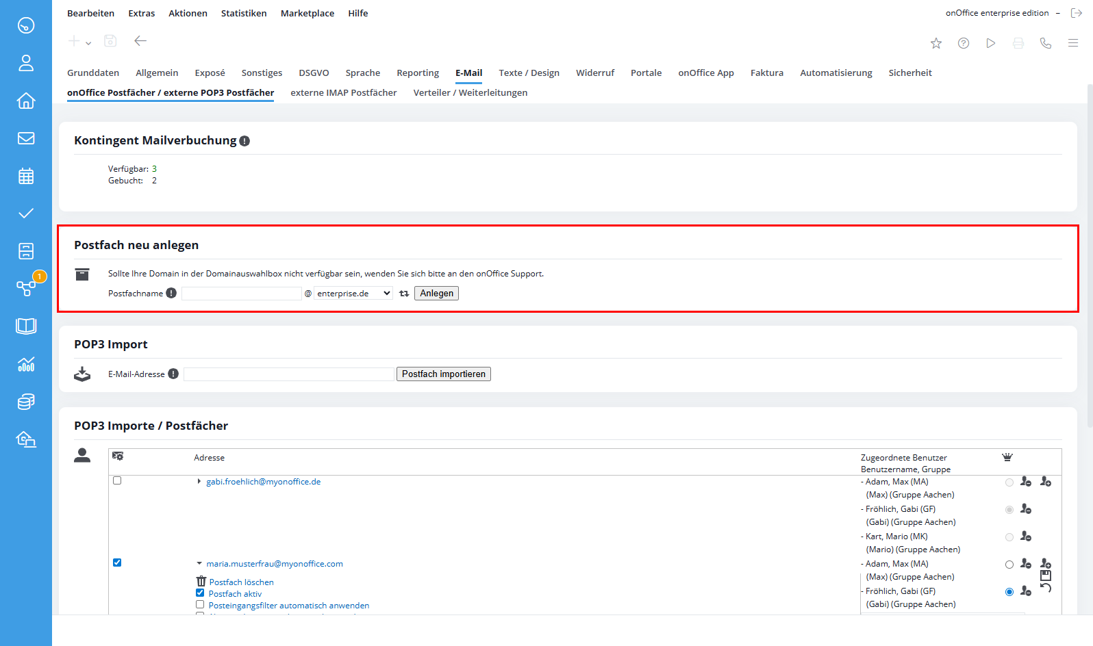 Benutzer für das Postfach können Sie über dier Spalte „Zugeordnete Benutzer“ hinzufügen und entfernen.