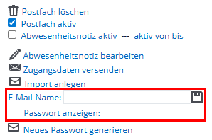 Nun erscheint das angelegte Postfach in der Liste mit den eventuell angelegten Postfächern. Sobald Sie auf den Namen des Postfaches klicken, erhalten Sie die Detailansicht, in der Sie das Postfach konfigurieren können. Sie können z. B. eine Abwesenheitsnotiz hinterlegen oder das Postfach deaktivieren.