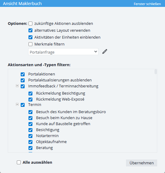 Im unteren Teil des Pop-up-Fensters können Sie auswählen, welche Aktionsarten / Aktionstypen im Maklerbuch angezeigt werden sollen. Setzen Sie die Haken bei den Aktionsarten / Aktionstypen, die dargestellt werden sollen.