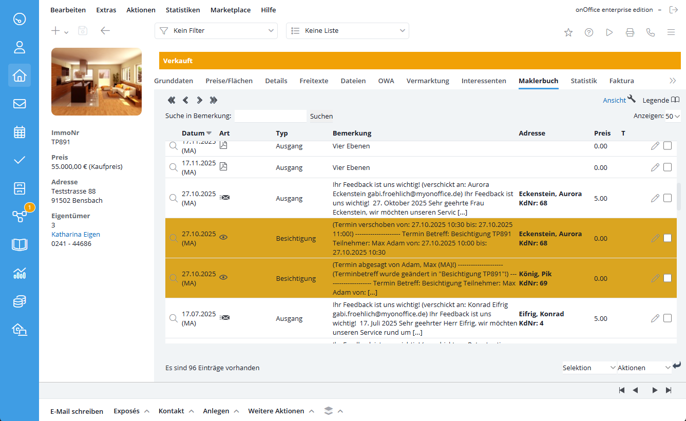 Über eine Weitere Funktion Aktivitäten der Einheiten einblenden können Sie im einer Immobilienanlage (Stammobjekt) auch die Maklerbucheinträge der verknüpften Einheiten darstellen.