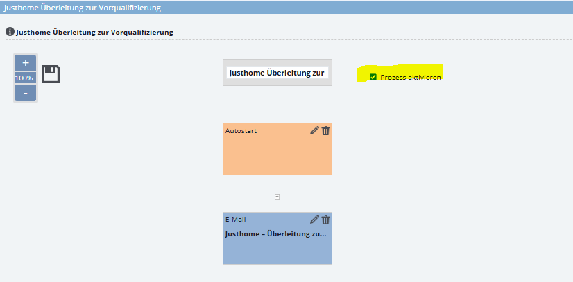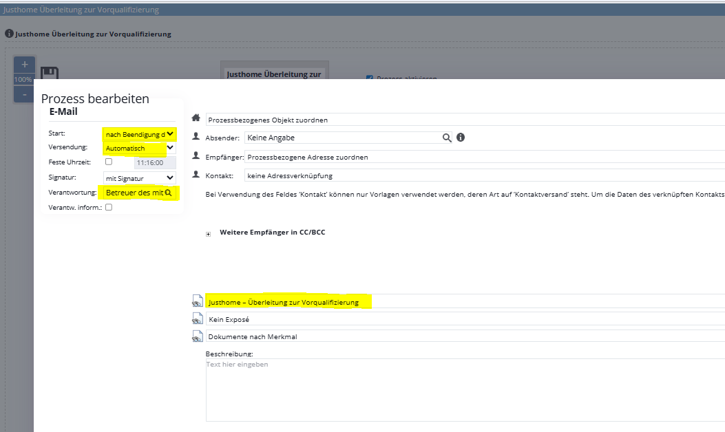 Per una collaborazione di successo con Justhome, ti consigliamo di impostare la seguente automazione e-mail per indirizzare i tuoi potenziali acquirenti alla consulenza finanziaria Justhome all’inizio del processo d’acquisto. Il vantaggio per te è che i tuoi clienti verranno prequalificati automaticamente tramite il portale finanziario generato nel tuo design. In questo modo riceverai rapidamente una prima valutazione su quale interessato disponga dei mezzi finanziari necessari per l’acquisto.