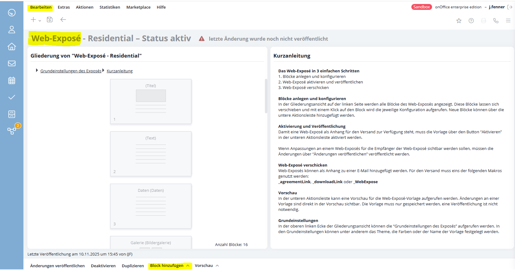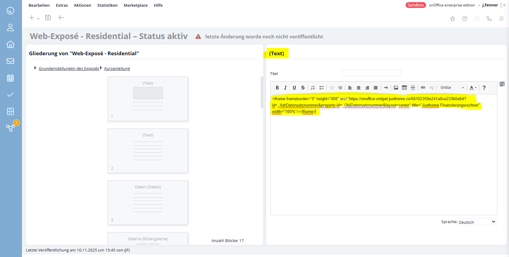 - Il blocco può essere successivamente posizionato liberamente nella brochure tramite drag & drop. Justhome consiglia di posizionarlo al di sotto della galleria immagini.