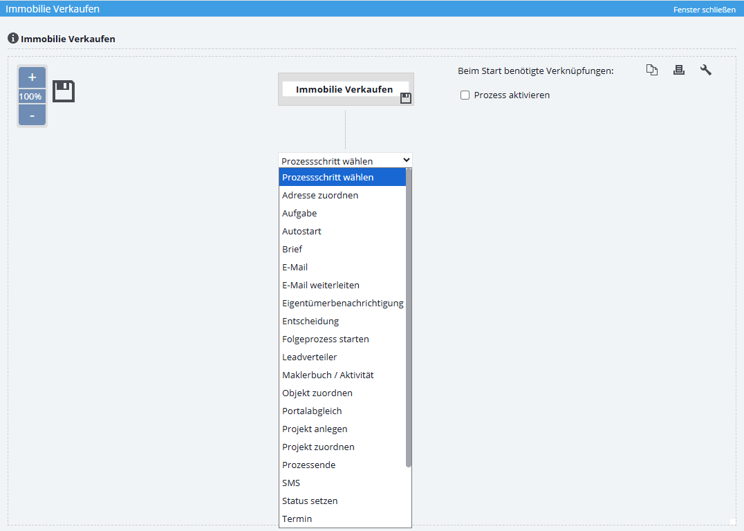 - Punkt 6: Manche Prozesse setzen einen Adress-, andere einen Immobilienbezug und manche beides voraus. Über „Status der benötigten Verknüpfungen“ erkennen Sie, ob und ab welchem Schritt ein Adress- und/oder Immobilienbezug nötig ist. Ist Adresse und/oder Immobilien nicht angegeben, ist auch kein Bezug für diesen Prozess nötig.
