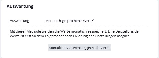 - Wenn die monatliche Auswertung deaktiviert wird oder die Statistik gelöscht wird, werden die gespeicherten Werte ebenfalls gelöscht.