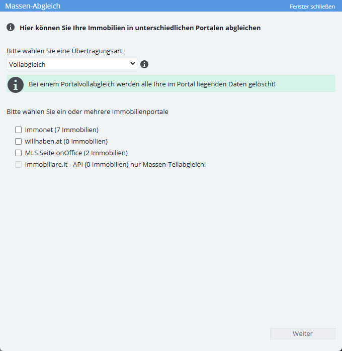 Welche Portale angehakt werden können und die Anzahl der Immobilien pro Portal, die für den Abgleich vorgemerkt sind, ändert sich in Abhängigkeit von der Übertragungsart.