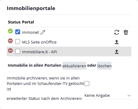 Im Beispielbild also die Portalschnittstellen zu Immowelt und ogulo.de. In diesen Portalen wird die Immobilie mit dem nächsten Portalabgleich neu eingestellt bzw. aktualisiert.