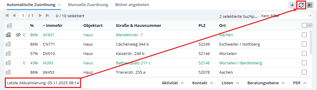 I risultati della ricerca degli immobili vengono aggiornati automaticamente per impostazione predefinita all’apertura della scheda (a condizione che l’impostazione dell’utente Impostazione utente “Aggiorna automaticamente i risultati della ricerca quando si entra nella ricerca dell’immobile” sia attiva). Inoltre, è possibile un aggiornamento manuale (solo per lo stato attualmente selezionato) tramite il simbolo di aggiornamento