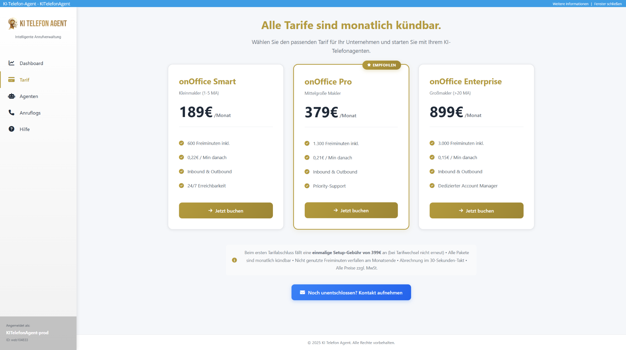 Info: Bei der ersten Buchung fällt eine einmalige Setup-Gebühr an. Diese deckt die gesamte Onboarding ab und wird bei zukünftigen Tarifwechseln nicht erneut berechnet.