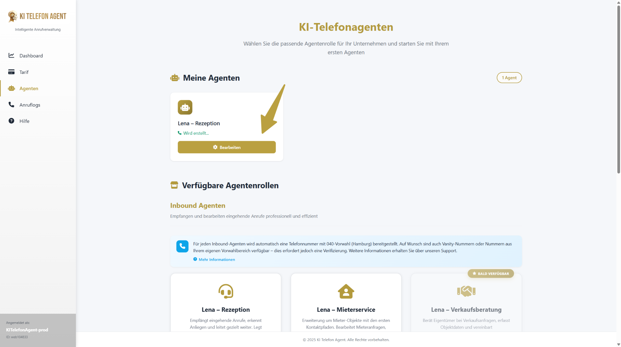 Nach der Tarifwahl ist es Zeit, Ihren digitalen Mitarbeiter zum Leben zu erwecken. Anstatt bei null anfangen zu müssen, bieten wir Ihnen Agentenrollen an – das sind vorkonfigurierte Vorlagen für typische Aufgaben wie z.B. „Lena – Rezeption“. Wählen Sie die Rolle, die am besten zu Ihren Zielen passt. Dies spart Ihnen wertvolle Einrichtungszeit, da alle grundlegenden Fähigkeiten und Gesprächsabläufe bereits hinterlegt sind. Nach der Auswahl wird Ihr Agent im Hintergrund automatisch eingerichtet.