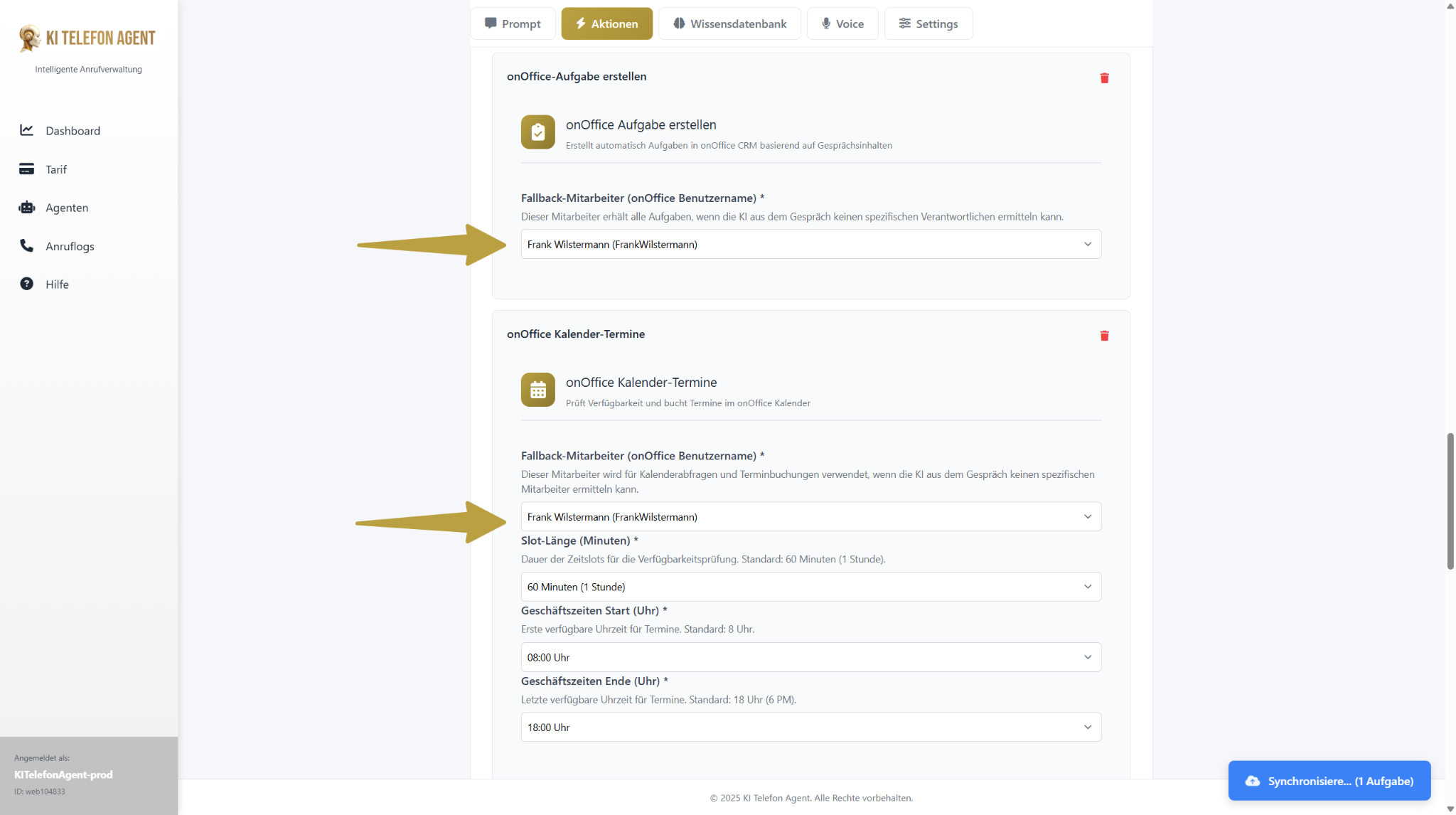 Dies ist der wichtigste Schritt für einen reibungslosen Betrieb. Ein Fallback-Mitarbeiter ist Ihr Sicherheitsnetz. Wenn der KI-Agent einen Termin vereinbart oder eine Aufgabe erstellt, aber aus dem Gespräch nicht eindeutig zuordnen kann, für welchen Mitarbeiter diese ist, wird sie automatisch diesem festgelegten Fallback-Kontakt zugewiesen. So stellen Sie sicher, dass keine wertvollen Anfragen oder Termine verloren gehen.
