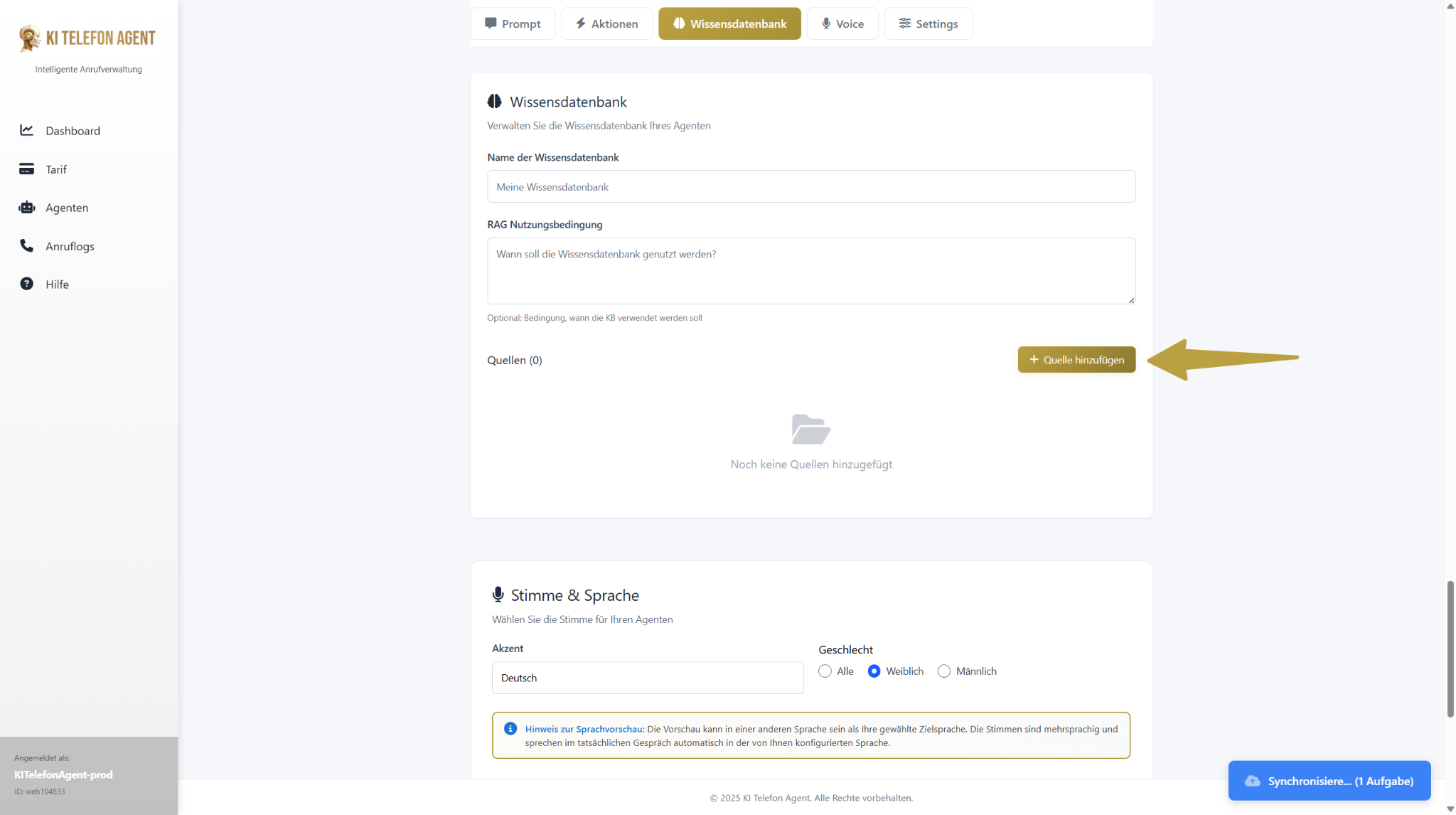 Ein intelligenter Agent ist nur so gut wie sein Wissen. Damit er spezifische Fragen zu Ihrem Unternehmen beantworten kann (z.B. zu Öffnungszeiten, Team-Mitgliedern oder Serviceangeboten), müssen Sie ihm diese Informationen zur Verfügung stellen. Wechseln Sie zum Reiter „Wissensdatenbank“ und klicken Sie auf „+ Quelle hinzufügen“. Fügen Sie hier die Links zu den wichtigsten Seiten Ihrer Webseite (z.B. „Über Uns“, „Leistungen“, „Kontakt“) oder laden Sie relevante PDFs hoch.