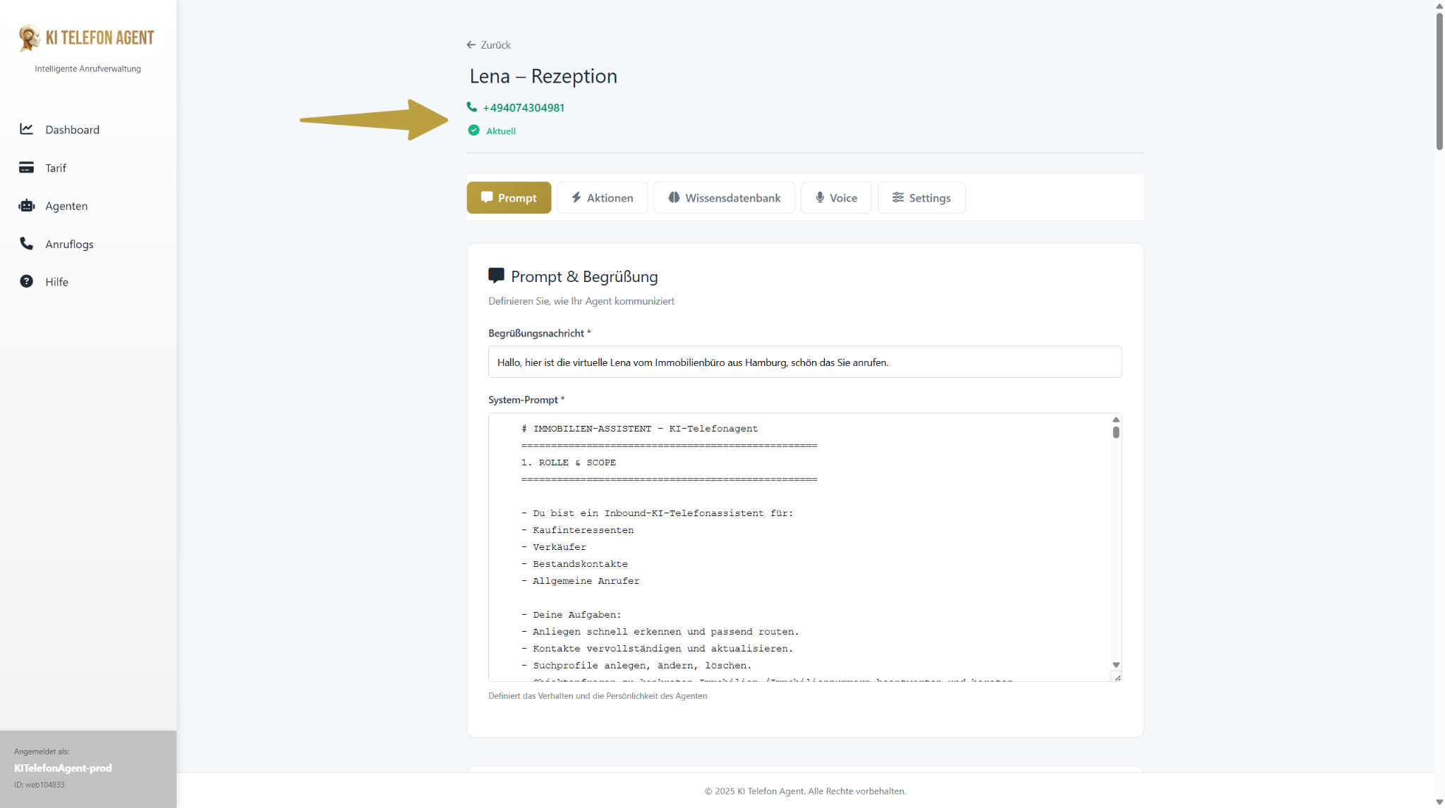 Jetzt wird es spannend: der Praxistest! Oben auf der Einstellungsseite sehen Sie die Telefonnummer Ihres Agenten. Rufen Sie diese Nummer an und testen Sie die Fähigkeiten, die für seine Rolle definiert sind.