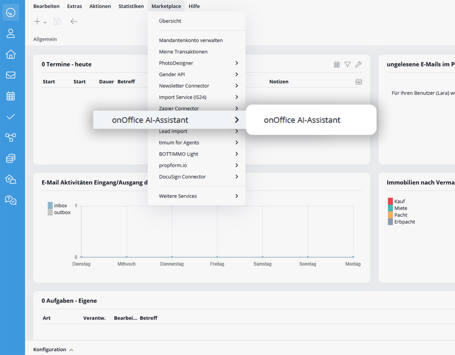 Alternativ gelangen Sie über die Menüleiste unter Marketplace >> onOffice AI Assistant >> onOffice AI Assistant in den Chat.