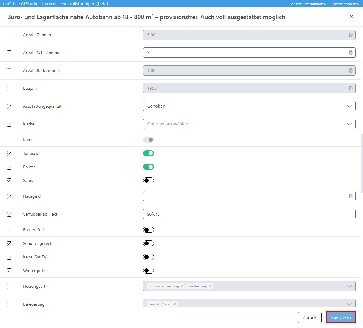 Speichern Sie den Datensatz in onOffice, wenn Sie zufrieden sind. Die Immobilie wird dann mit den neuen Daten aktualisiert.